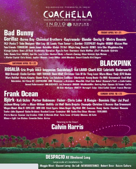 Gli headliner del Coachella 2023, per due weekend consecutivi, saranno Bad Bunny (che suonerà il 14 e 21 aprile), le Blackpink (che suoneranno il 15 e 22 aprile) e Frank Ocean (che suonerà il 16 e 23 aprile)